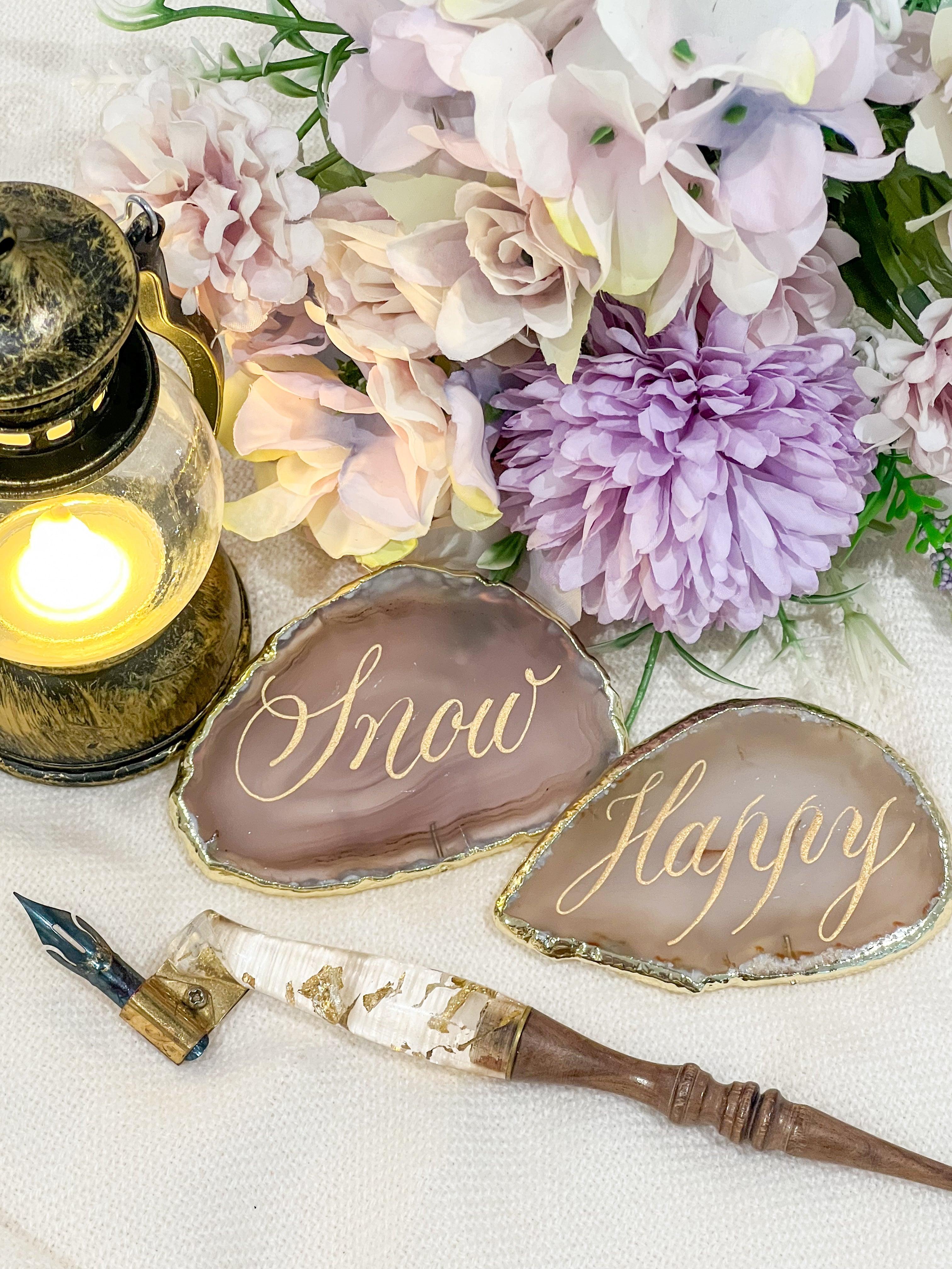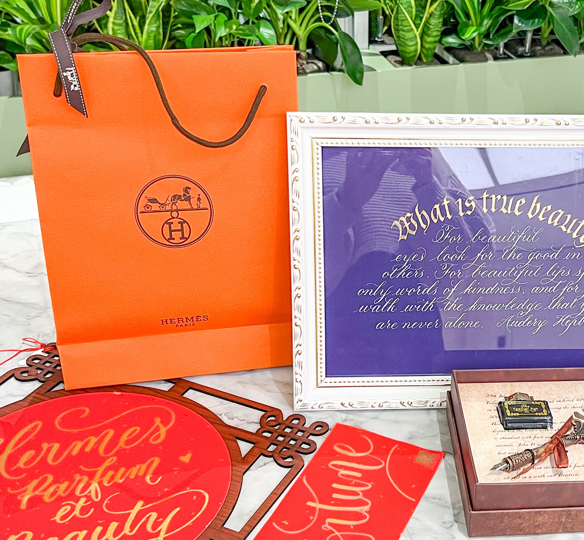 Calligraphy can be presented on gifts in different materials such as plastic, leather, glass, paper and wood. Bespoke handwriting delivers your sincerity, respect and treasure to your guests and beloved ones, because you value them so much!