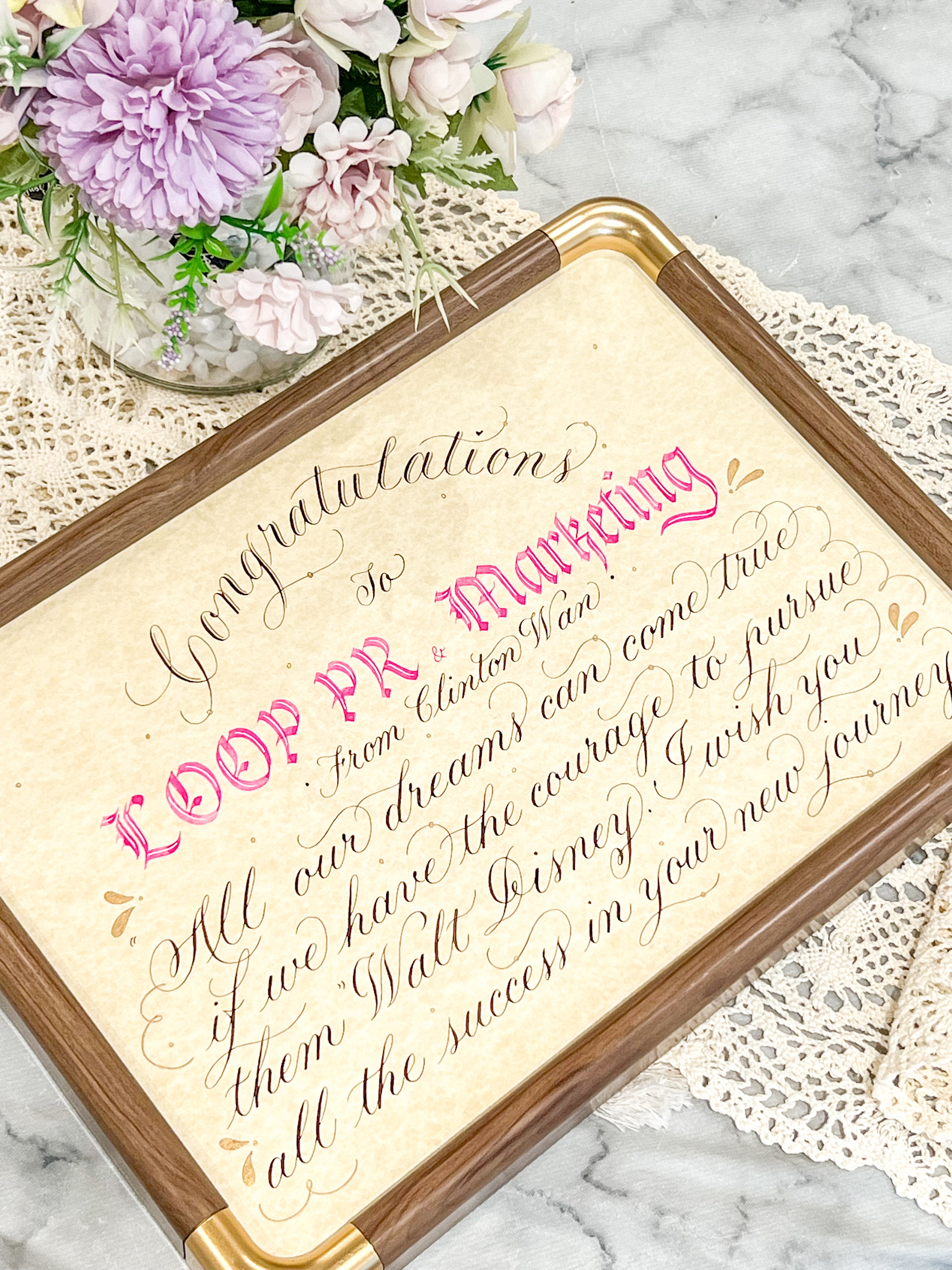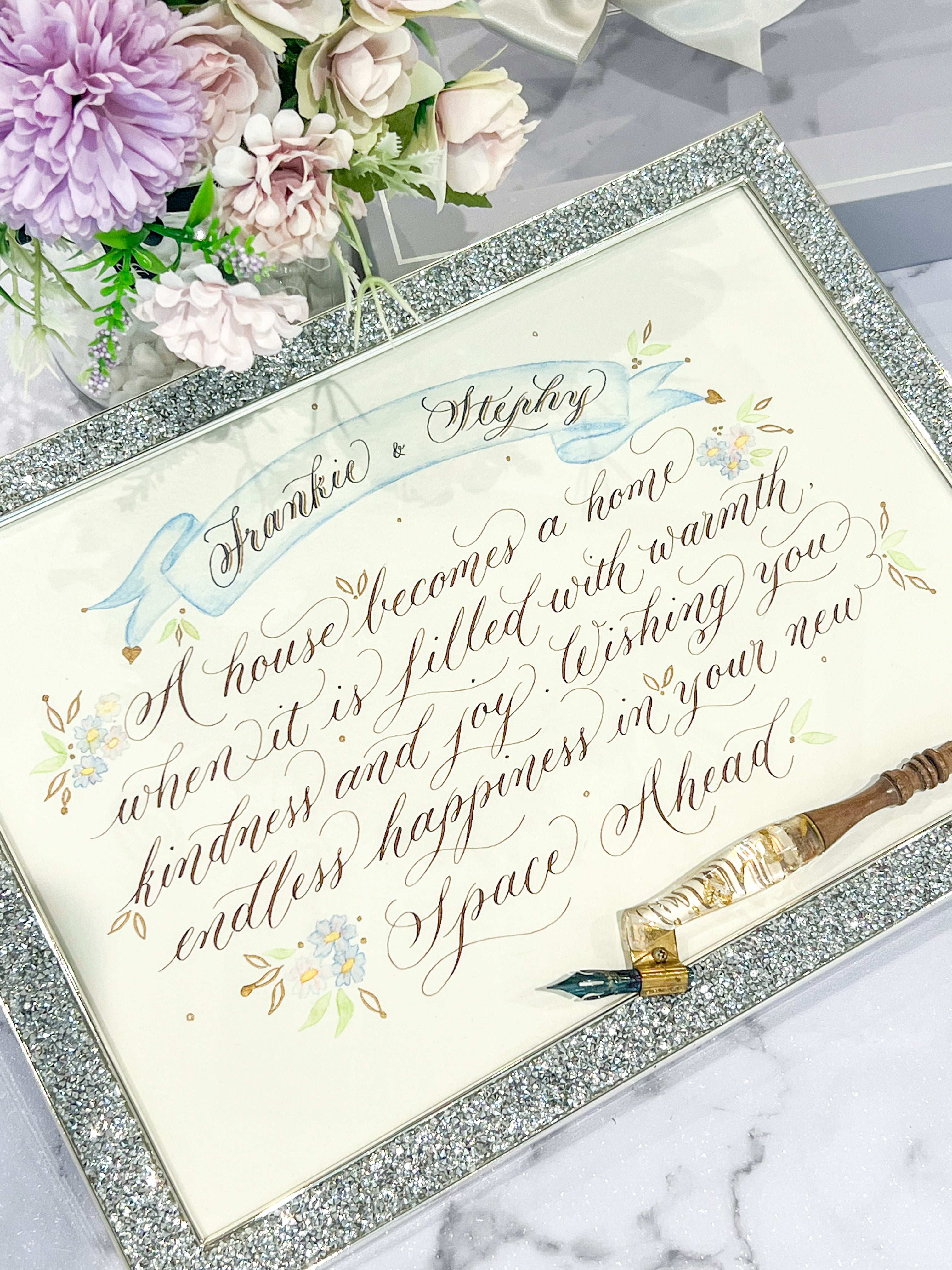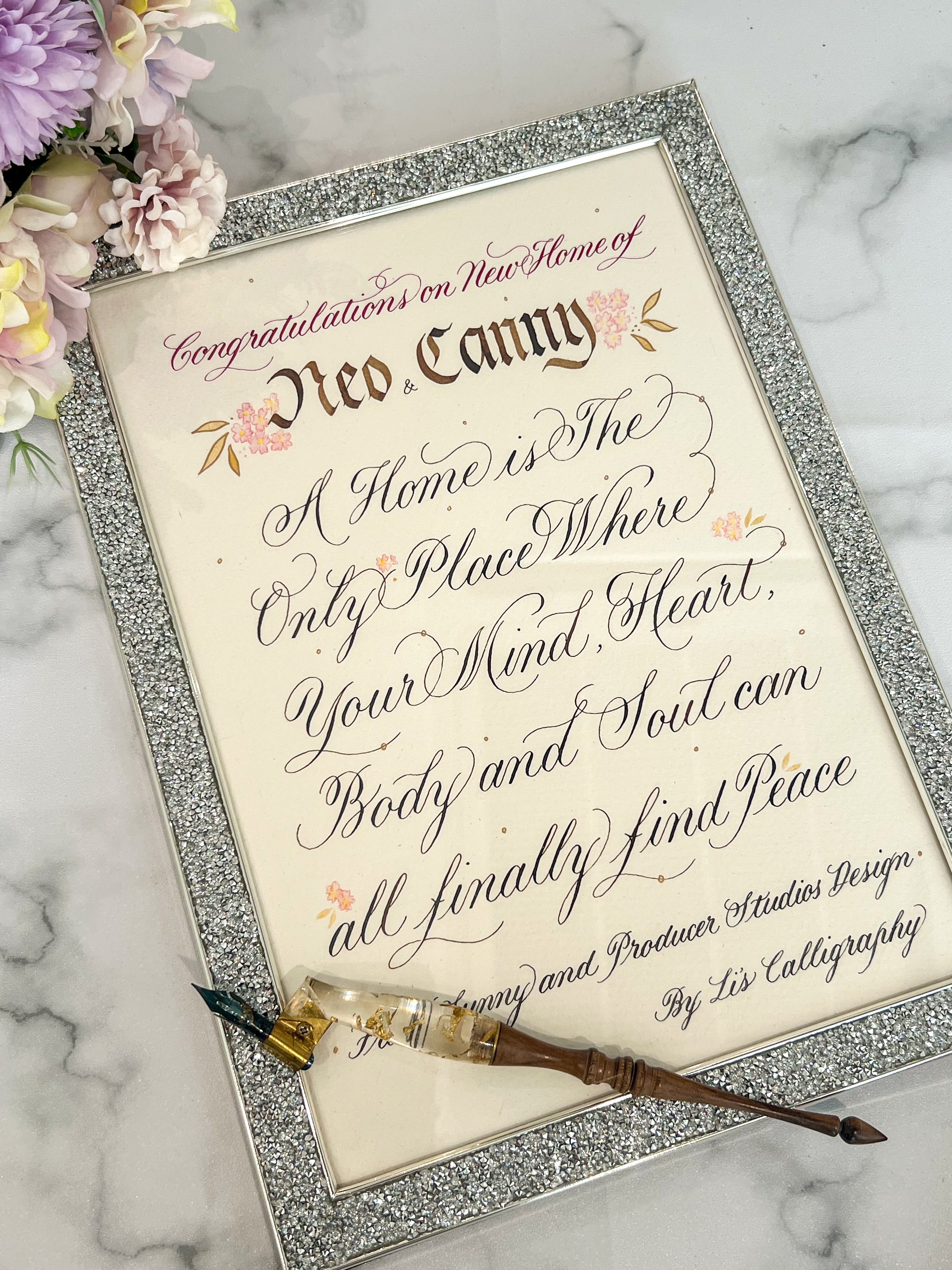 I write different Scripts such as Gothic, Italic, Copperplate and Modern. Each of the scripts delivers a different temperament on your gifts or cards. My Calligraphy can be presented on different materials such as plastic, leather, glass, paper and wood. Let my handwriting enlighten your gifts with an exclusive warmth. It's always my pleasure and honour to share the unique happiness of Calligraphy through your gifts.